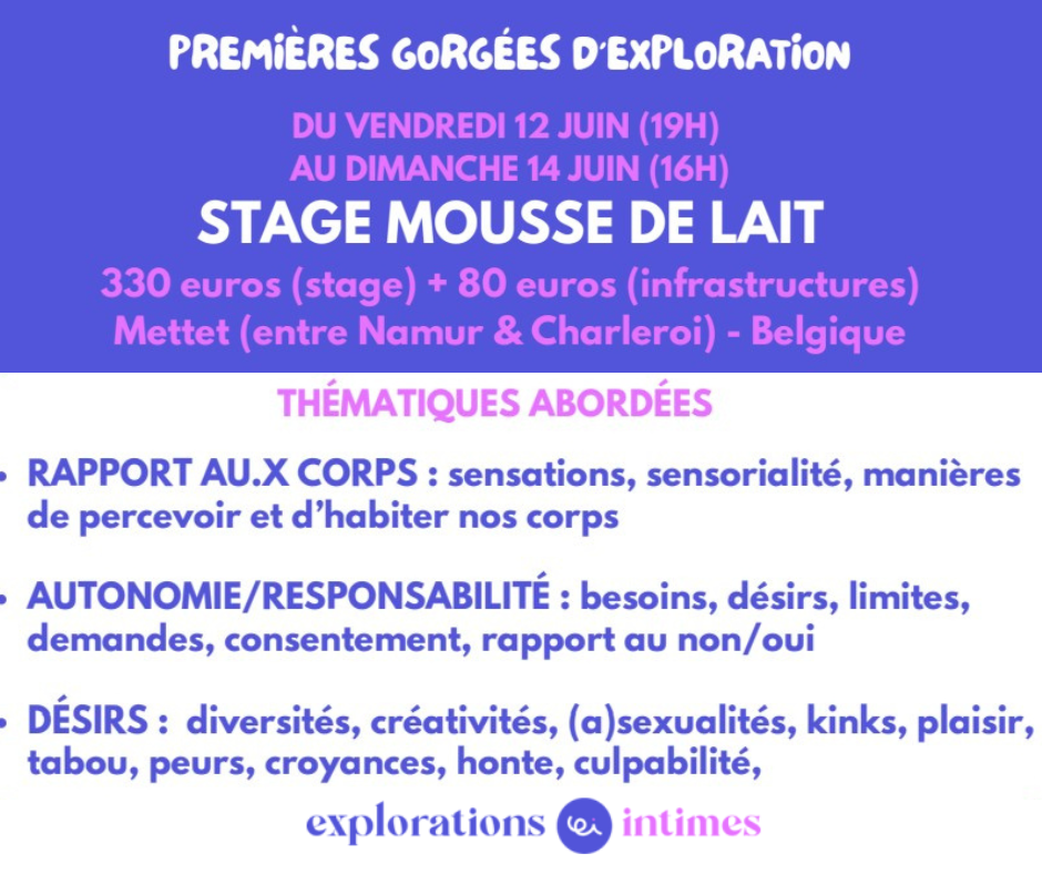 Si tu cherches un stage pour explorer le rapport aux corps, à tes désirs, besoins, limites, aux sexualités, … Un espace pour pratiquer et renforcer ta souveraineté, ta communication relationnelle, le consentement. Explorer avec créativité et souveraineté, loin des normes établies, avec respect et autonomie. C’est par ici !!